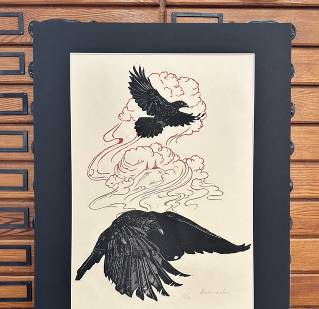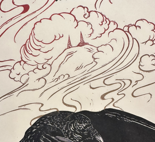 Two ravens carve through the sky, wings outstretched, with Snaefell mountain just visible in the clouds—like it’s hidden beneath Mannanán’s cloak. Rosie’s hand-carved work is full of movement, mythology and layered detail, blending natural forms with Manx folklore.
